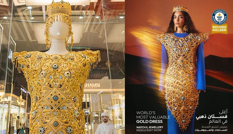 ‘দুবাই ড্রেস’ চারটি প্রধান অংশে তৈরি। এতে একটি স্বর্ণের মুকুট (৩৯৮ গ্রাম), নেকলেস (৮,৮১০.৬০ গ্রাম), কানের দুল (১৩৪.১ গ্রাম) ও হেয়ার পিস (৭৩৮.৫ গ্রাম) আছে। পুরো পোশাকটি ২১ ক্যারেট খাঁটি স্বর্ণ দিয়ে নির্মিত।