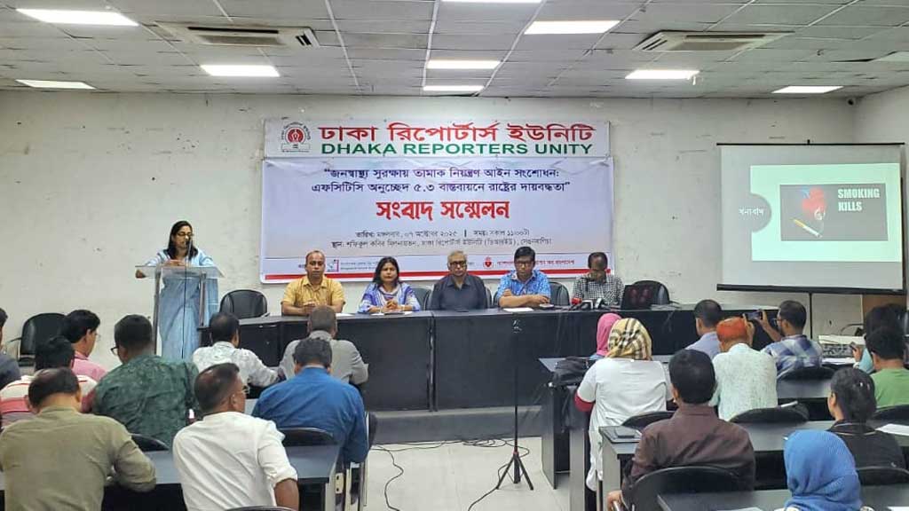 মঙ্গলবার (৭ অক্টোবর) ঢাকা রিপোর্টার্স ইউনিটিতে ‘জনস্বাস্থ্য সুরক্ষায় তামাক নিয়ন্ত্রণ আইন সংশোধন: এফসিটিসি অনুচ্ছেদ ৫.৩ বাস্তবায়নে রাষ্ট্রের দায়বদ্ধতা’ শীর্ষক সংবাদ সম্মেলনে এ দাবি জানানো হয়। ন্যাশনাল হার্ট ফাউন্ডেশন অব বাংলাদেশের সহযোগিতায় বাংলাদেশ হেলথ রিপোর্টার্স ফোরাম এ সংবাদ সম্মেলন আয়োজন করে।