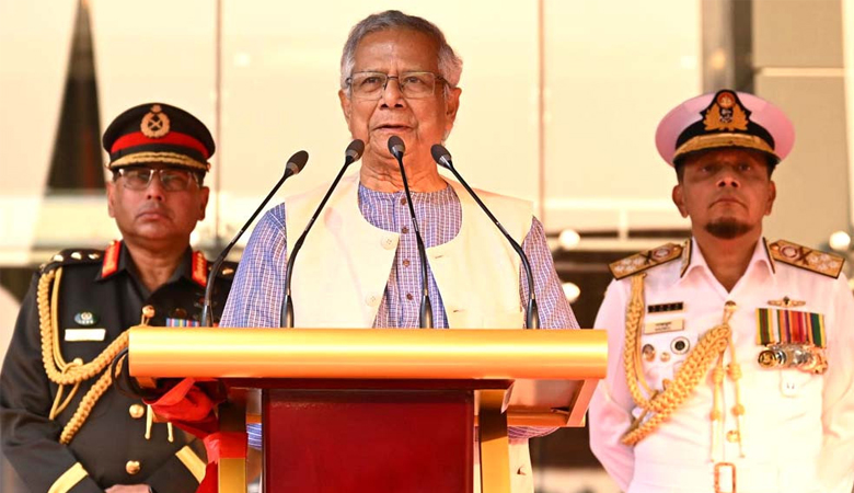 মুহাম্মদ ইউনূস বলেন, একটি শান্তি প্রিয় জাতি হিসেবে আমরা সব বন্ধু রাষ্ট্রের সাথে সম্মানজনক সহাবস্থানে বিশ্বাসী। তথাপি, যেকোন আগ্রাসী বহিঃশত্রুর আক্রমন থেকে দেশের সার্বভৌমত্ব রক্ষার জন্য আমাদেরকে সদা প্রস্তুত এবং সংকল্পবদ্ধ থাকতে হবে। এ লক্ষ্যে আমাদের সেনা, নৌ ও বিমান বাহিনীর আধুনিকায়ন, উন্নত প্রশিক্ষণ এবং উন্নত বিশ্বের সাথে তাল মিলিয়ে বাহিনীগুলোতে যুগোপযোগী প্রযুক্তি সংযোজনের প্রয়াস অব্যাহত রয়েছে।