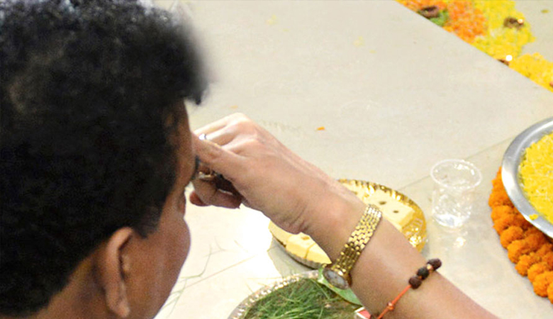 এরপর চলে আশীর্বাদের পালা। আশীর্বাদের সময় ধান ও দূর্বার শিষ ব‍্যবহৃত হয়। এছাড়া পূজার থালিতে শঙ্খ, প্রদীপ, মধু নেওয়া হয়। সঙ্গে মিষ্টিমুখ ও উপহার তো থাকেই। দিনে বা রাতে বিশেষ খাবারের আয়োজনও করা হয়ে থাকে।