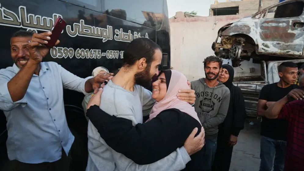 কারাবন্দিদের স্বাগত জানাতে পশ্চিম তীরের বেইতুনিয়া ও গাজার খান ইউনিসে জড়ো হয়েছিলেন শত শত ফিলিস্তিনি।
